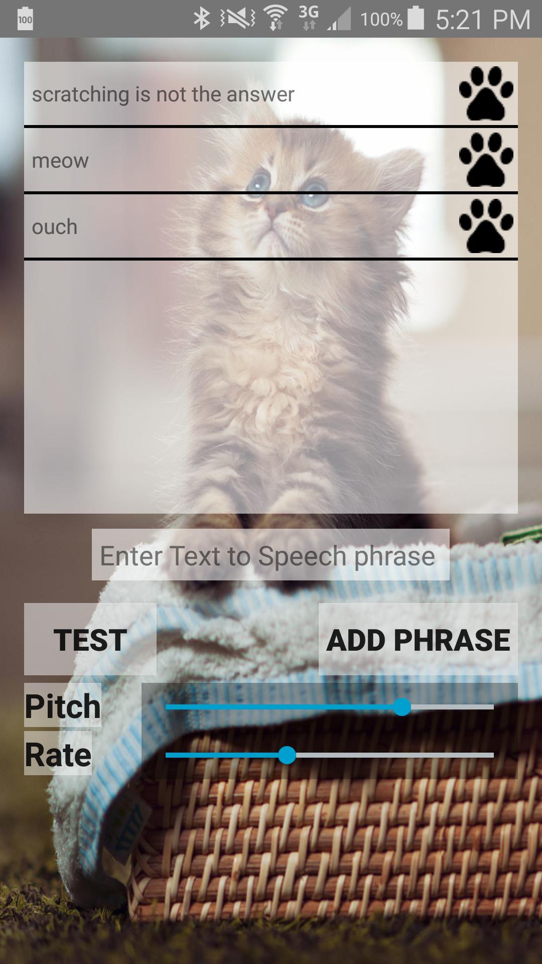 -TextToSpeech(TTS)- Allows the user to write their own phrases that are said when the cat touches the ball. The ball disappears for a few seconds while the phrase is said, and then continues moving. You can also customize the Pitch and Rate of speech for the TTS voice.