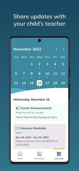 Get photos and videos of your child’s day in class and access them at any time in the Memories section—you can also save your favorites to your phone or tablet.