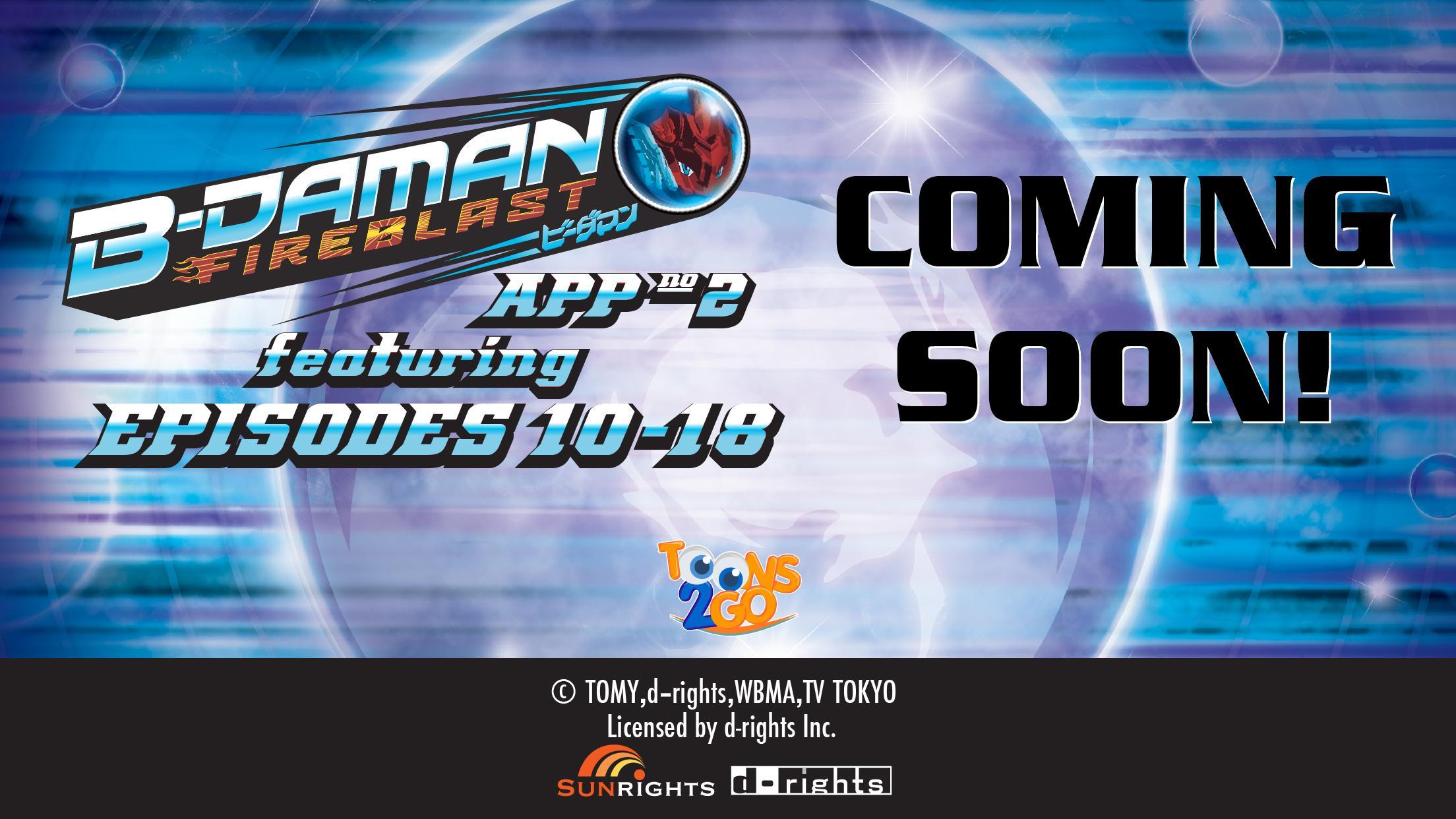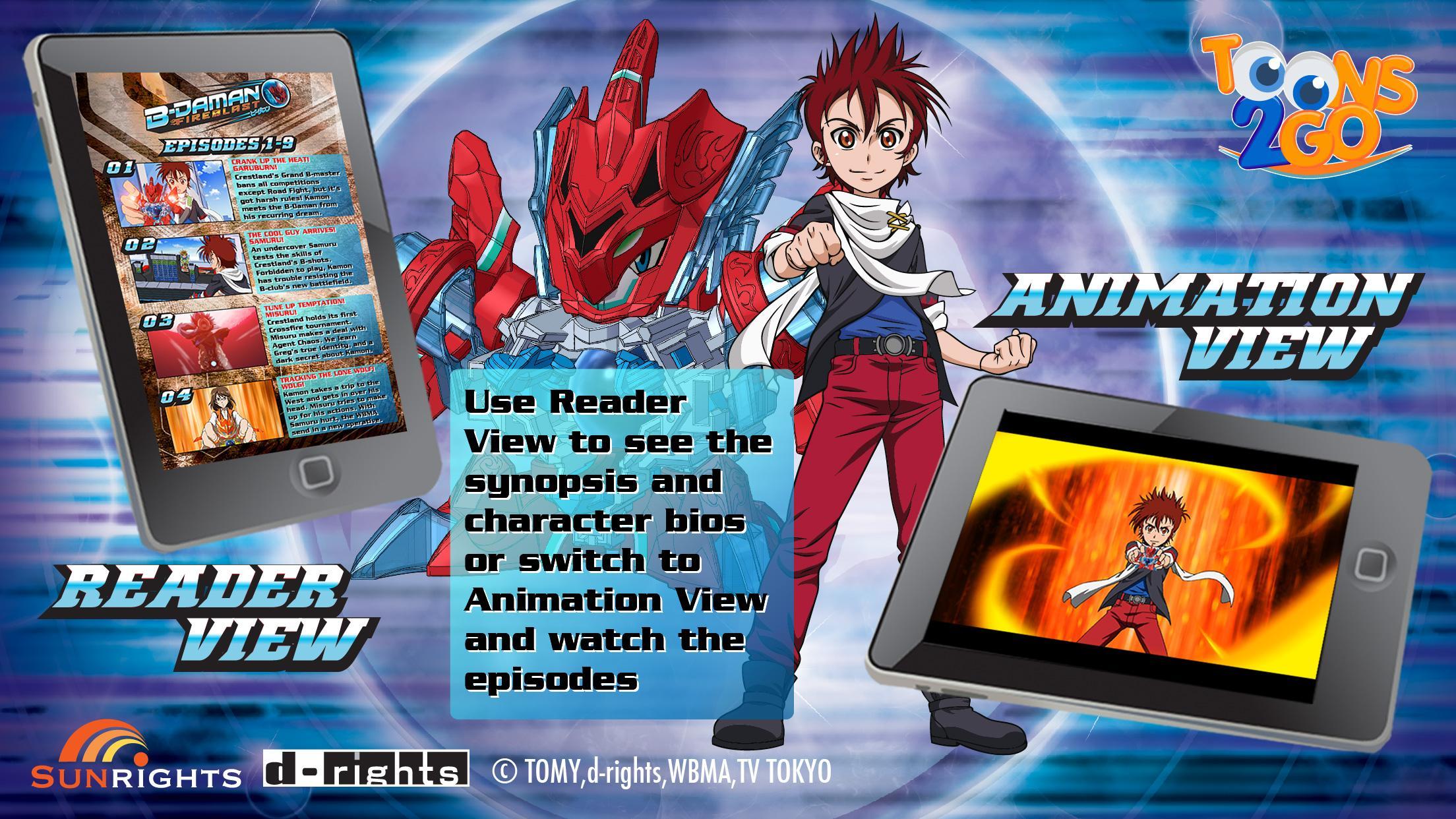 Toons 2 Go brings you the B-Daman Fireblast 1 app! This app features Episodes 1-9 of animation derived from the hit battle toy series and inspired by the Japanese anime manga Cross Fight B-Daman.