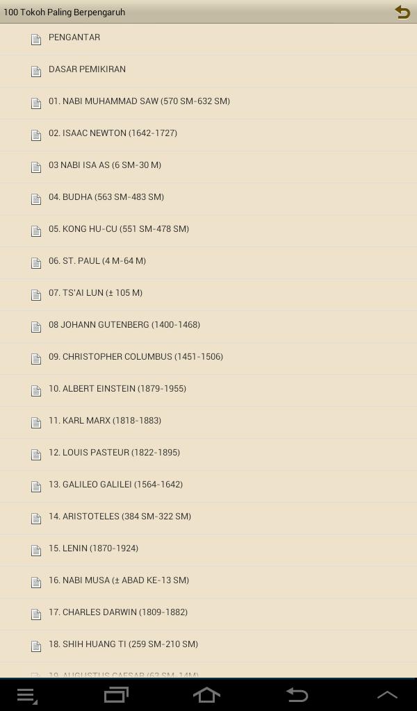 This application is based on the book "One Hundred The Most Influential Figure in History" by Michael H. Hart, published in 1978, which was then translated by H. Mahbub Djunaidi, published by PT. The World of Library Jaya in 1982. Additional from me was taken from several literature on the internet.