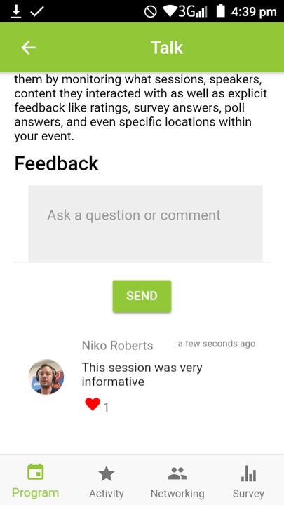 Engage with other attendees, speakers and event staff. See the agenda, answer questions and give the organisers feedback.