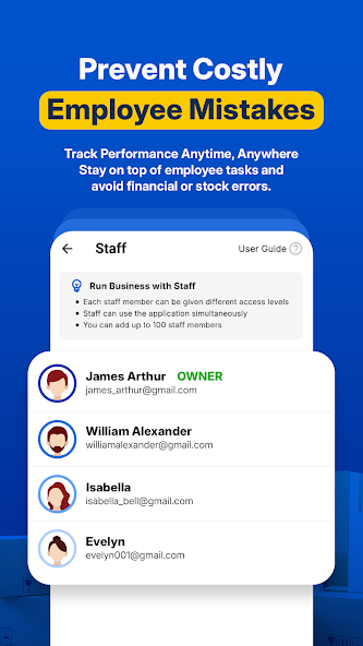 Streamline operations with integrated staff management and accounting features. Add team members, control access levels, and monitor performance directly in the app. Advanced accounting tools help track finances and make informed business decisions.