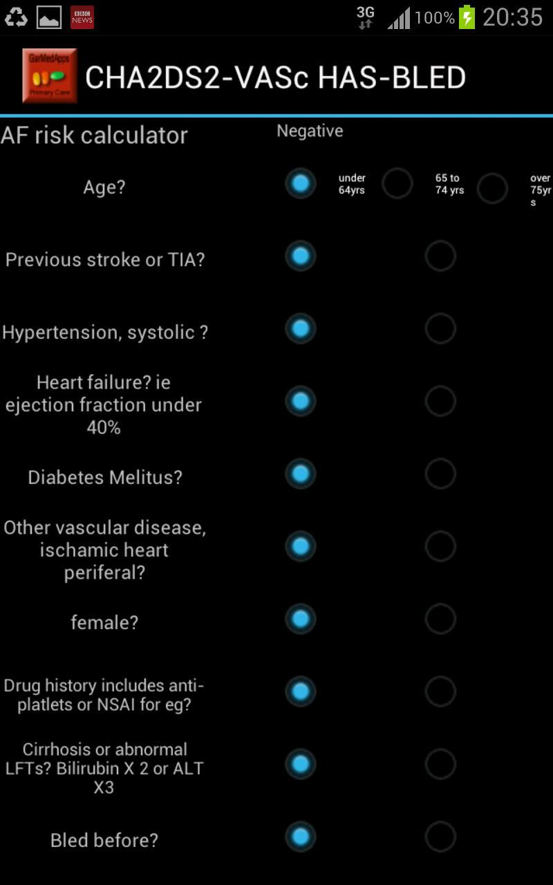 Taking up considerably less space than other similar scoring systems, this is aimed at the assessment of patients with non valvular atrial fibrillation. It provides a clean and simple to use tool to assess risk of stroke and medication induced bleeding. There is no decision support, use your local guidelines.