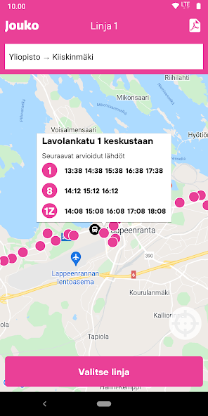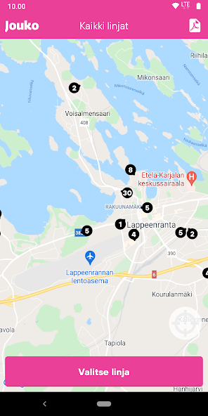 With the help of the application, it is possible to browse public transport schedules and stops in the Lappeenranta region on a map basis and to track where the buses are moving in real time.