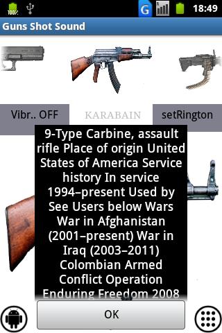 In this application, you will find a lot of sounds of shots from various types of firearms including shotgun , pistols , rifles , machine guns , carbines , assault rifles , handguns , machine gun , and other arms.