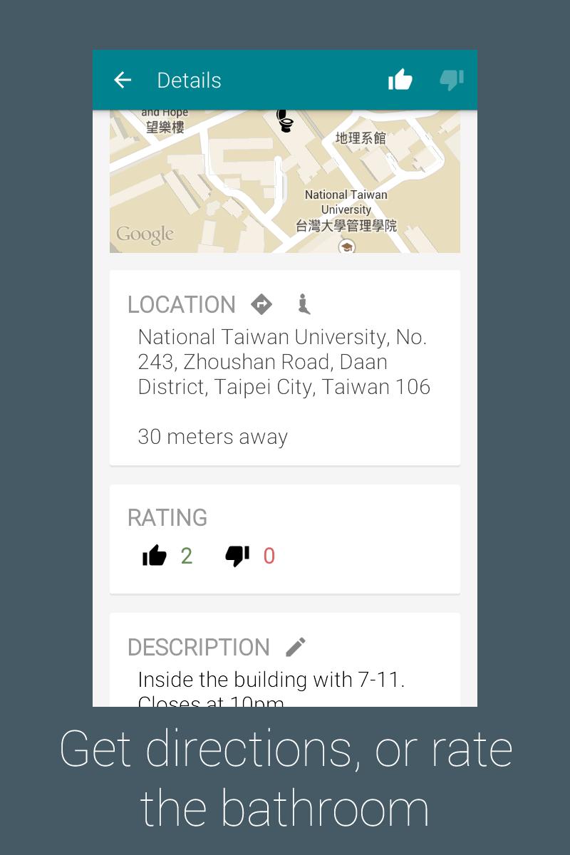 • Intuitive and quick interface - find a toilet within seconds of opening the app and enjoy a beautiful Material design in the app