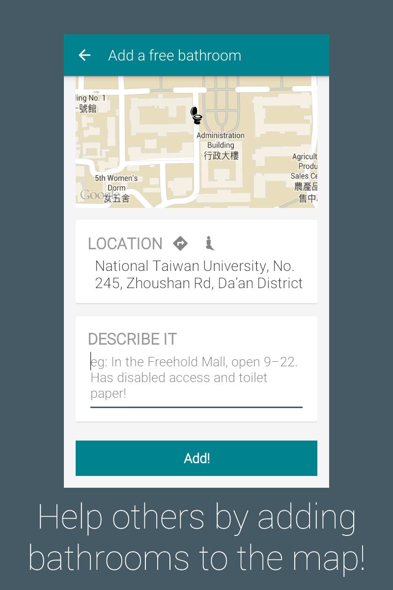 To add a bathroom, just long-press the location on the map and enter a short description. You can include as many details as you think would be helpful, such as opening hours, accessibility, inclusion of toilet paper, etc, but there is no pressure to do so.