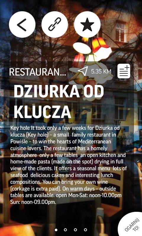The Application users can choose the places of interests from various categories, create their own routes, save favorite places, add comments about places, that will be visible for other users and can also connect with FB. The Application is bilingual and allows to choose preferred language: Polish or English.