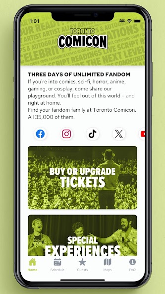 This is the official app for Toronto Comicon. If you're into comics, sci-fi, horror, anime, gaming, or cosplay, come share our playground. You'll feel out of this world – and right at home. Find your fandom family at Toronto Comicon. All 35,000 of them. Download for the latest schedule, show map, and guest updates to help plan your weekend.