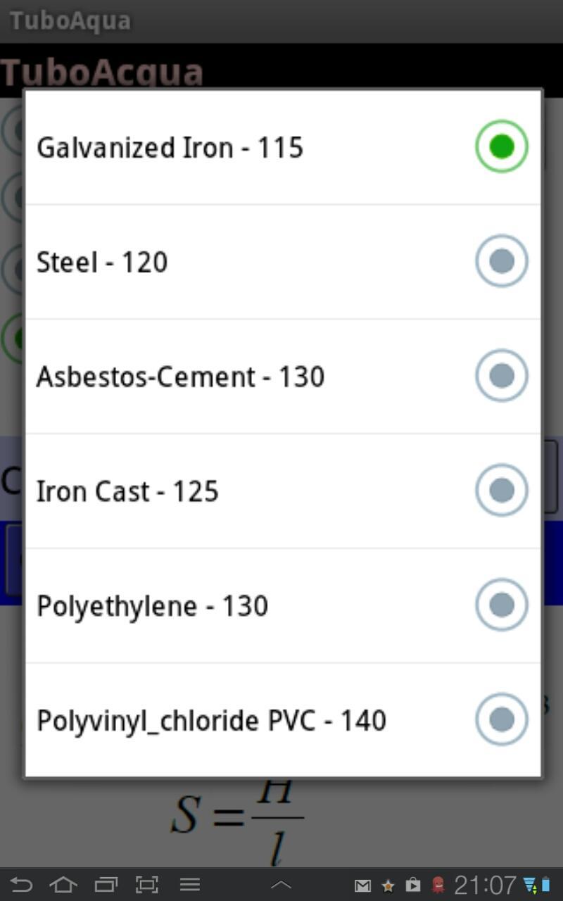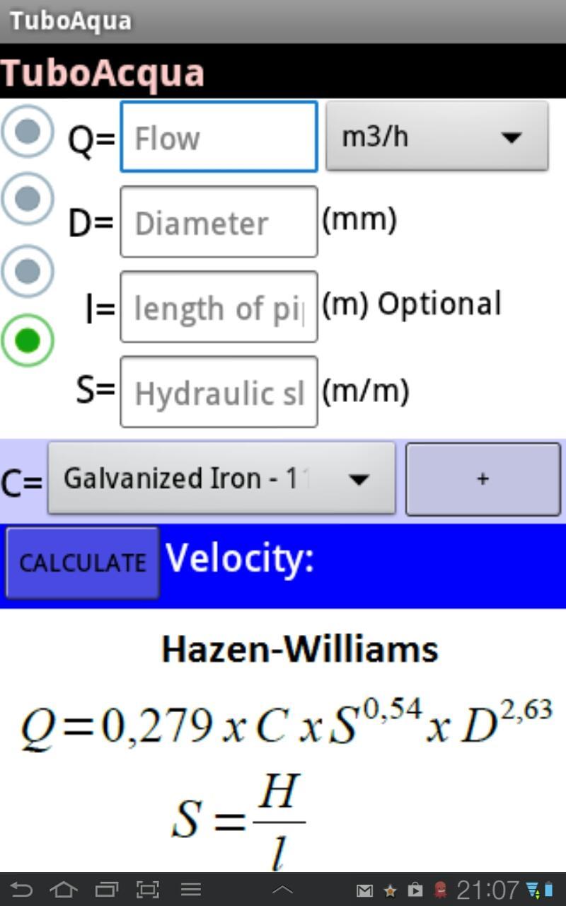 TUBOACQUAPerdas is an application used in hydraulic design of pipes to calculate pipe pressure. The APP uses the Hazen-Williams formula to calculate head loss, hydraulic slope, diameter, length of pipe, and speed of the water flow in the pipe. It has a lot of flexibility to perform the calculations, it allows you to choose various units of measurement to insert the data flow. In addition to being able to choose different types of pipe materials with the respective coefficient values C and can edit and insert additional values of coefficients for new materials and even simulate the aging of the tubing.