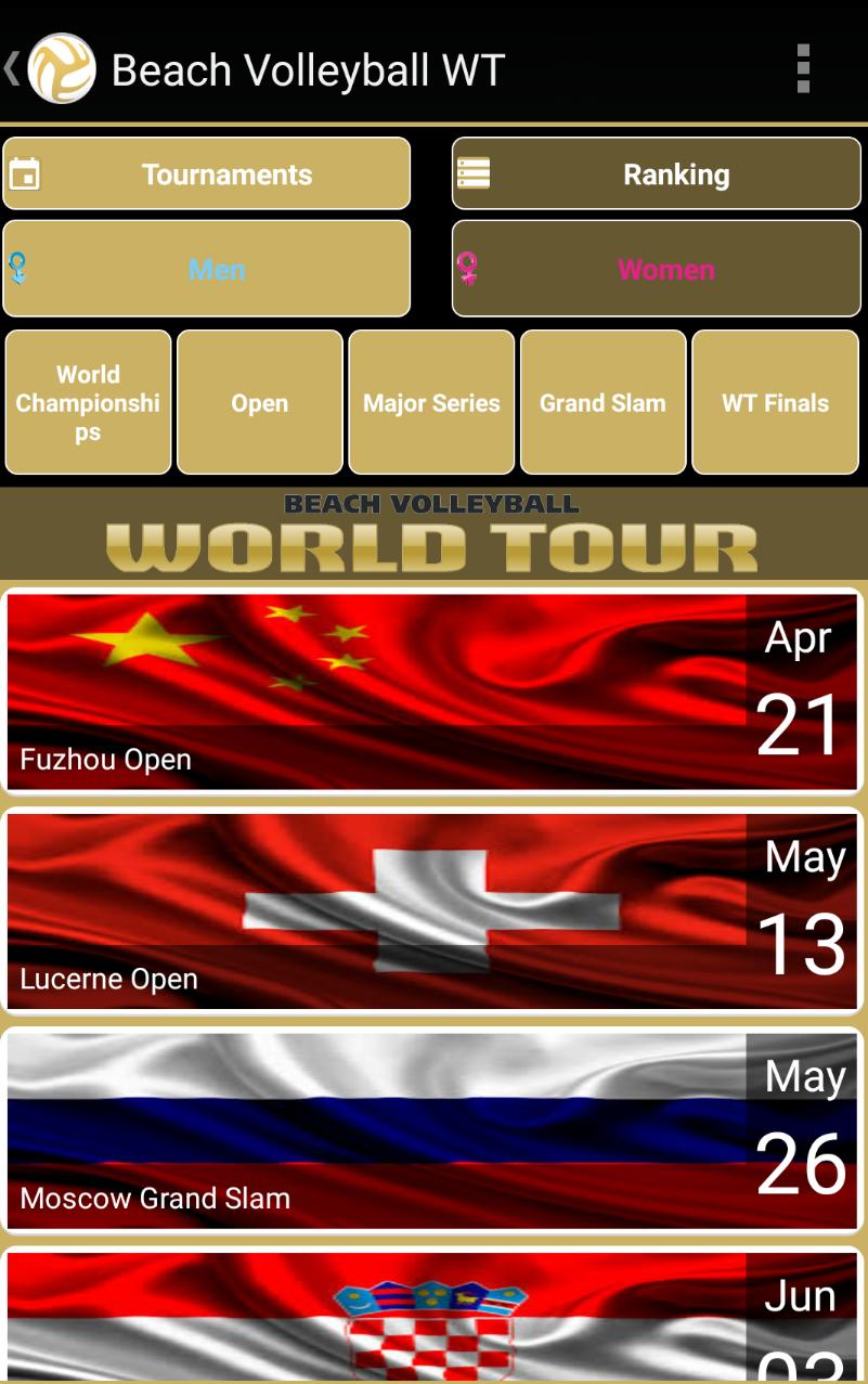 Find out all the information related to beach volleyball : World Tour calendar (open, major series, grand Slam, world championships...) ,qualification, results, rankings...