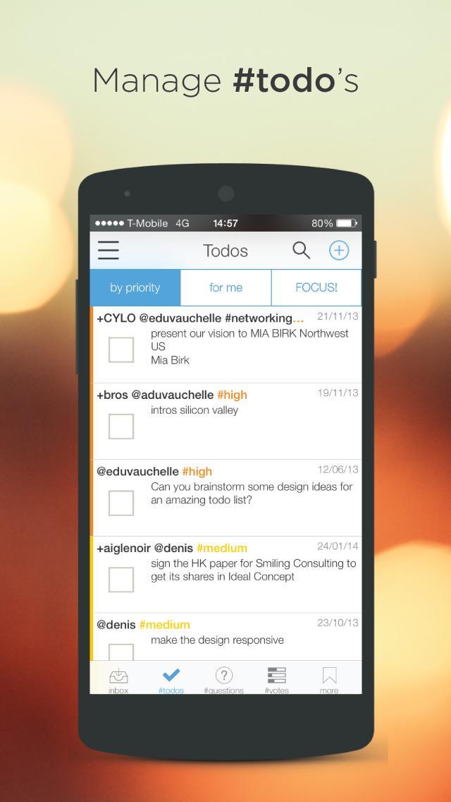 The conversations then magically turn into actionable lists and notes on the click of a simple button. The hashtag-based language makes sure that nothing is ever lost and tasks can be inserted directly in a conversation.