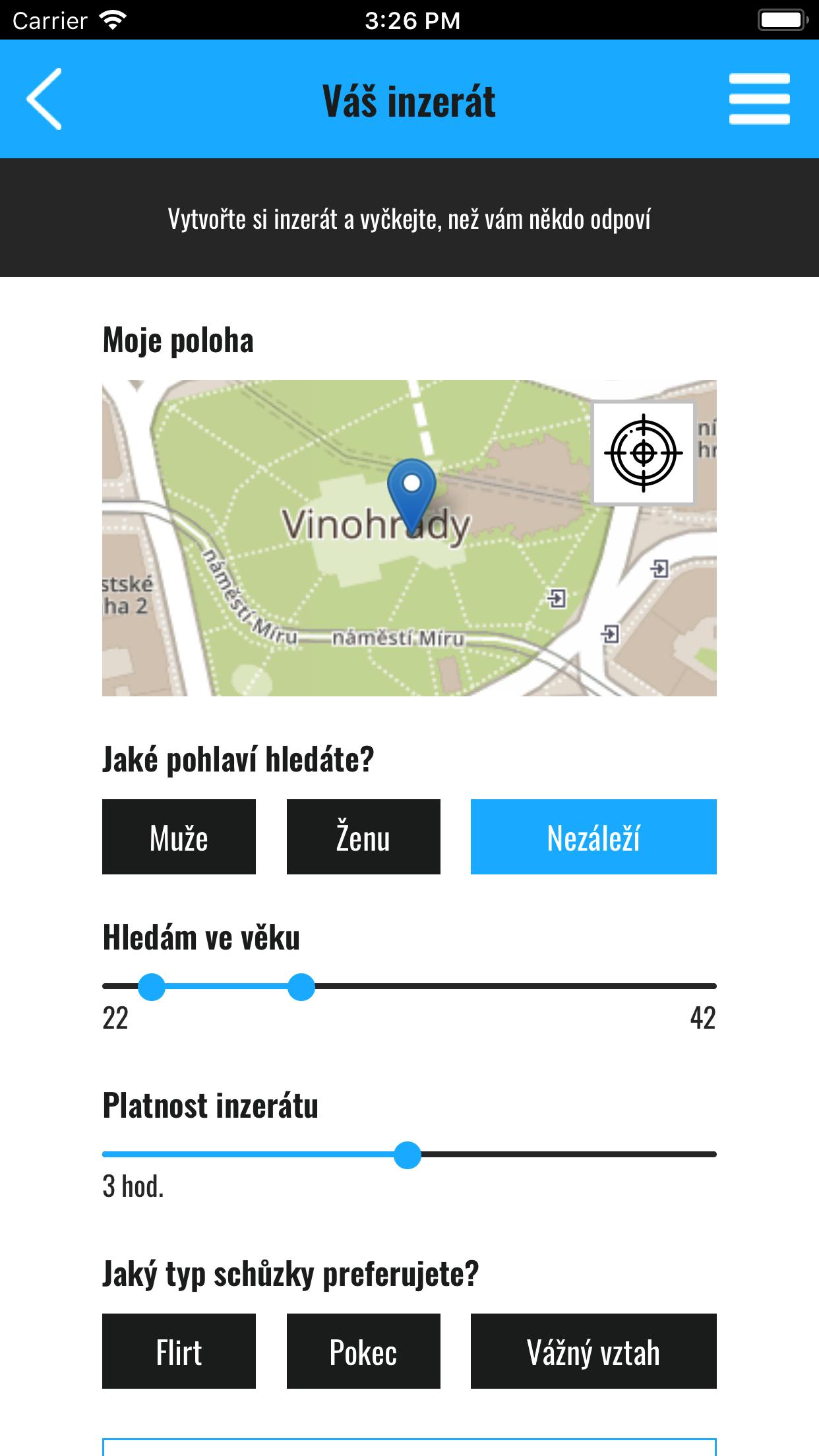The application also works the other way around. You can sit at home, or walk outside, turn on the app and see the posted ads near you. React to one or more of them and enjoy the possibility of getting to know new friends.