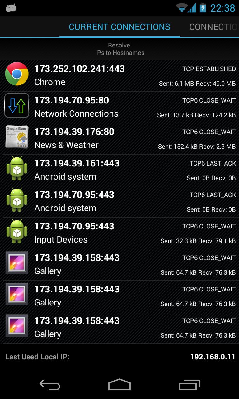 Powerful tool that displays and monitors (tracks) all inbound and outbound connection from and to your Android device. A low-level connections capture module ensures best performance with a minimal battery usage.