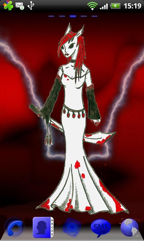 Beautiful female hunter with blood on her white dress... mystery and amazing. On the second picture she is in the darkness. She have red demonic eyes. If you like dark side of live and horrors, this theme is made for you too.