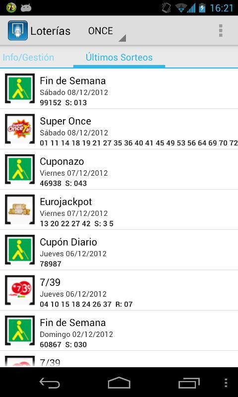 "... Thanks to the Loterías application we can quickly access a list with the last award-winning numbers, indicating the respective game, time and date of the number ...": http://www.eresandroid.com/consulta-los-los-los-nuumeros-premiados-y-controco-tus-aartos-con-Loterias/