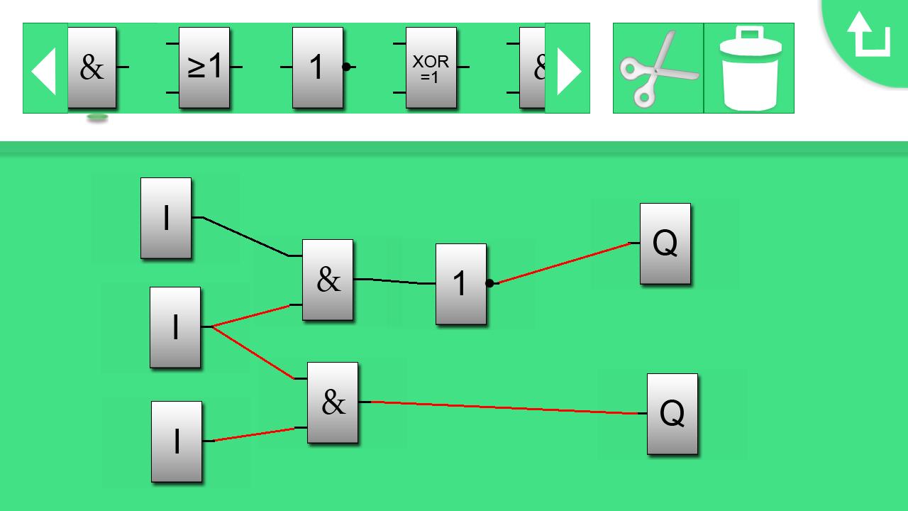You can use logic operators like AND, OR, NOT, consequence, equivalence, Set-Reset, Input, Output and electronic components like battery, resistor, diod, fuse, bulb, inductor and capacitor.