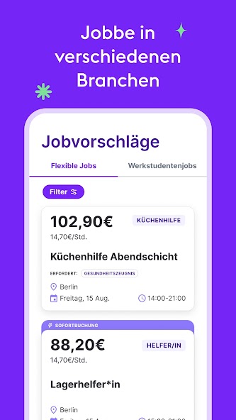 Zenjob is a job finder app where you can find part-time jobs without having to search for a job. We match you with suitable jobs that you can do alongside your studies according to your preferences. As part of short-term employment, you can book the temporary jobs you like best in our app - without having to write a single application.