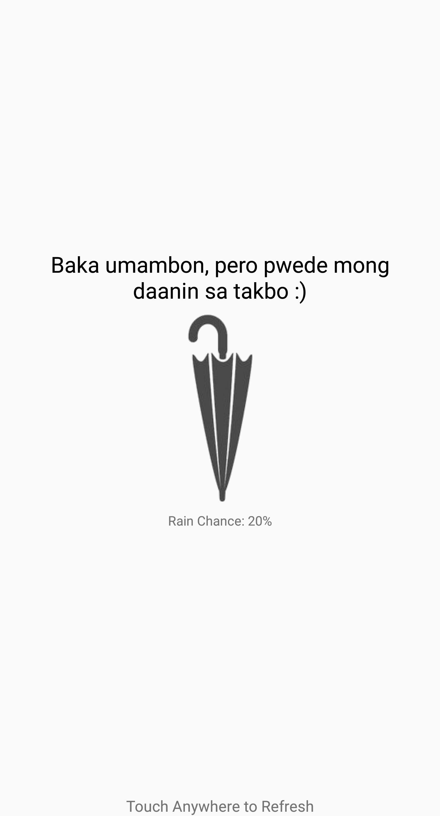 Are you going outside? in a mall? going to buy somewhere near? this app suggests if you need to bring your umbrella. It identify the chance of rain. You know, bringing that big bulky long umbrella can cause you trouble (such as losing your 1 hand just to carry it... lol)