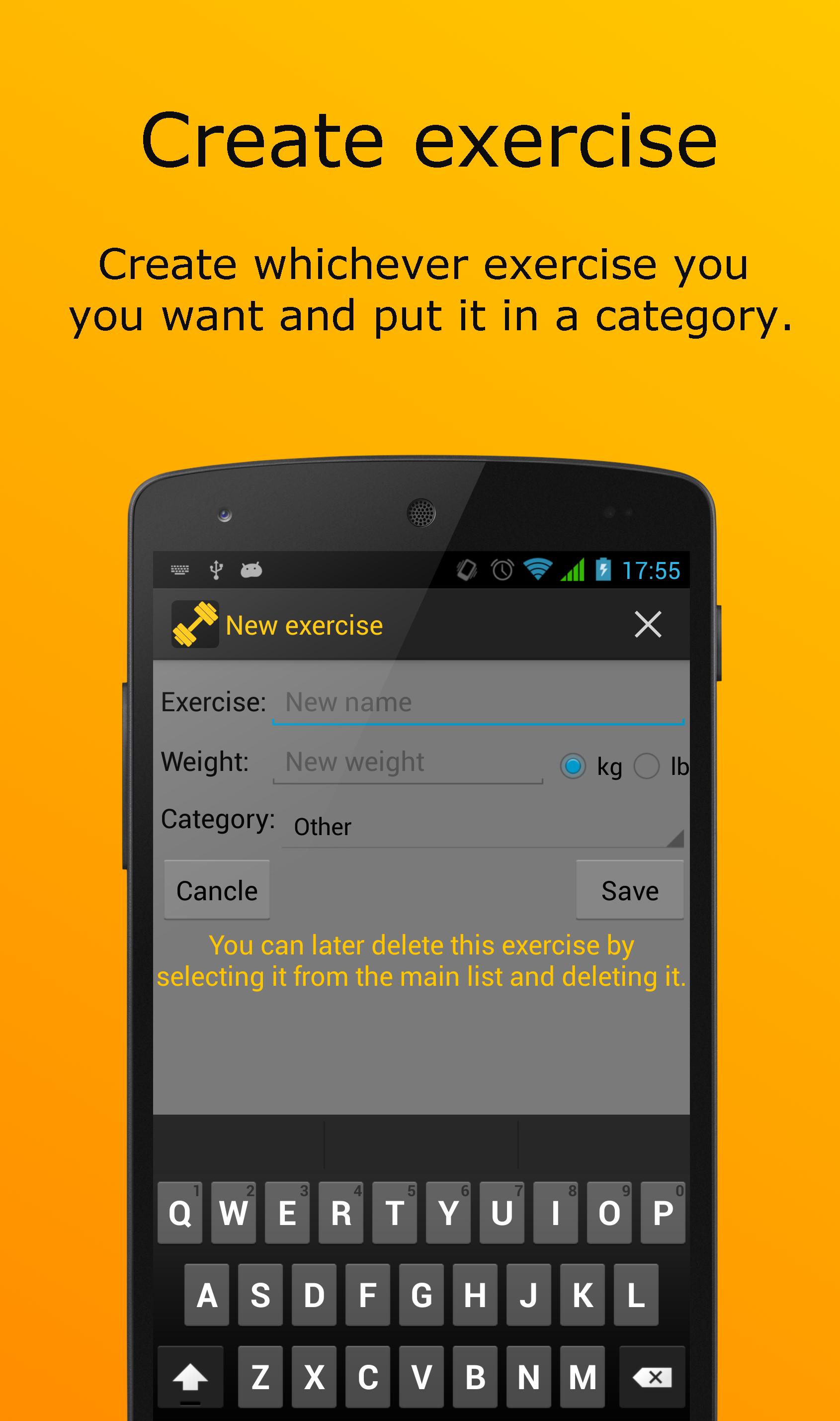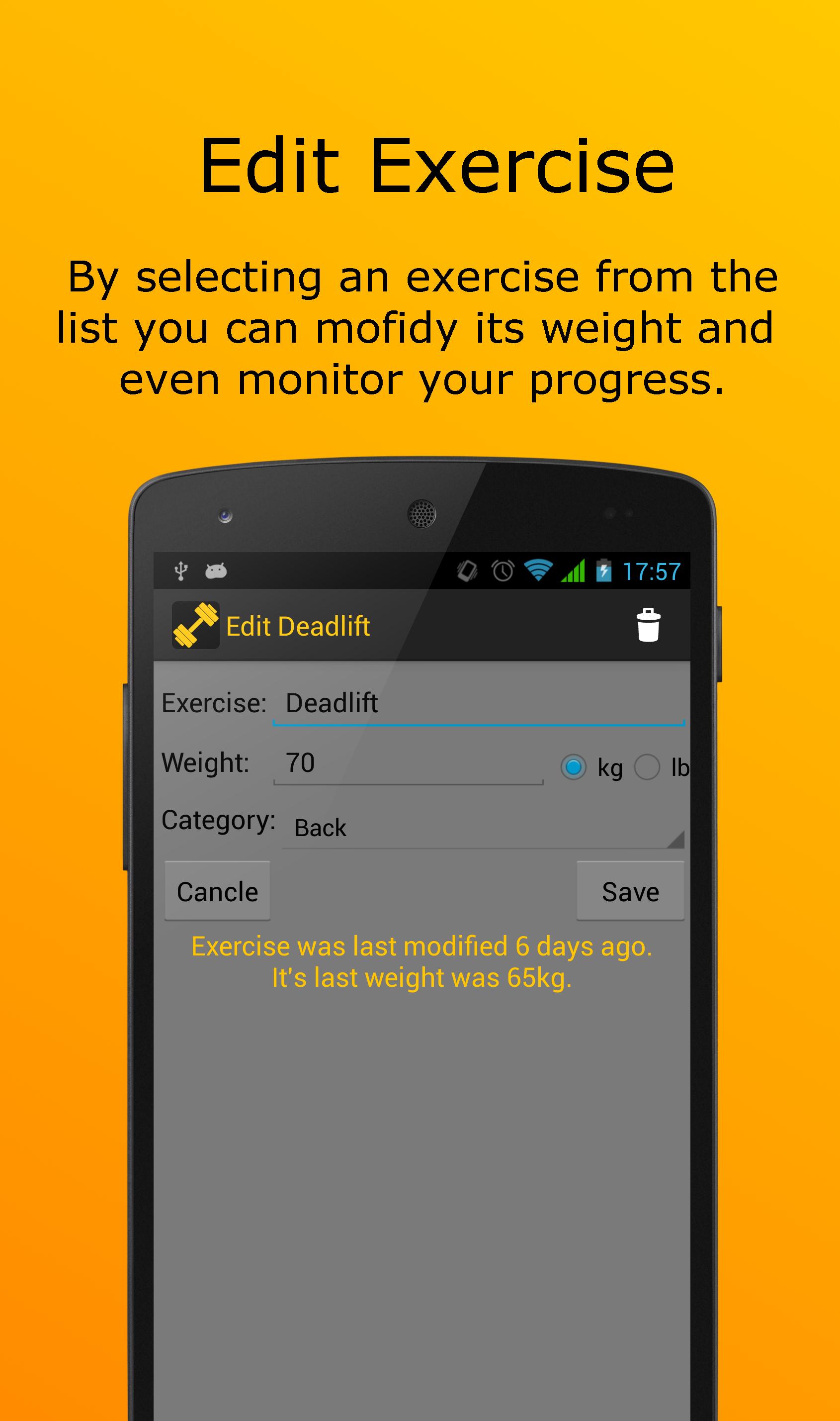 You create your own exercises, set the weight for them and sort them in basic muscle groups. When you increase the weight of an exercise the app will show you its last weight and the number of days past so you can see your progress rate.