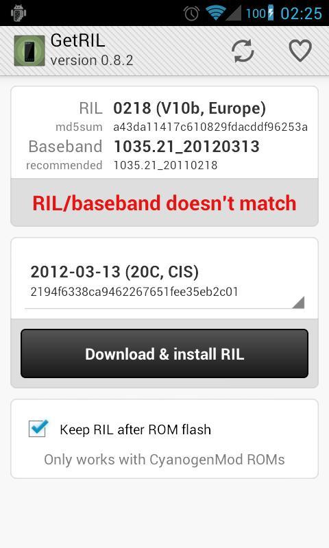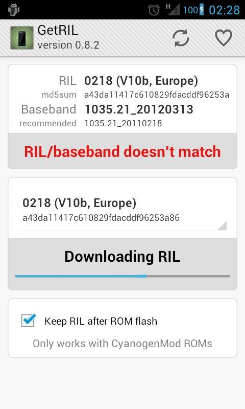 GetRIL shows the device's current RIL (Radio Interface Layer) and baseband, notifying you if they match or not. If not - and you're on a rooted device - you'll be able to download and install a new matching RIL.