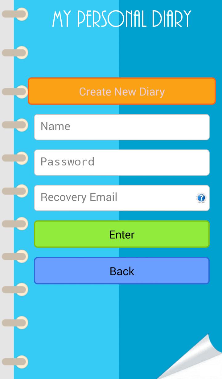 You can recover your password through email. Just set the email id in the options menu to recover the password. Everytime you create a diary you can associate an email with it so that you can recover the password in case you forget. Please note once you set the email id you CAN NOT change it at the later stage. You can add email id in the options menu also so that you don't have to type your email id every time you create a diary.