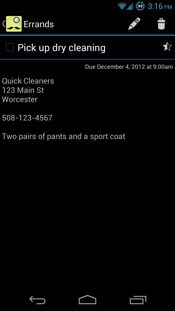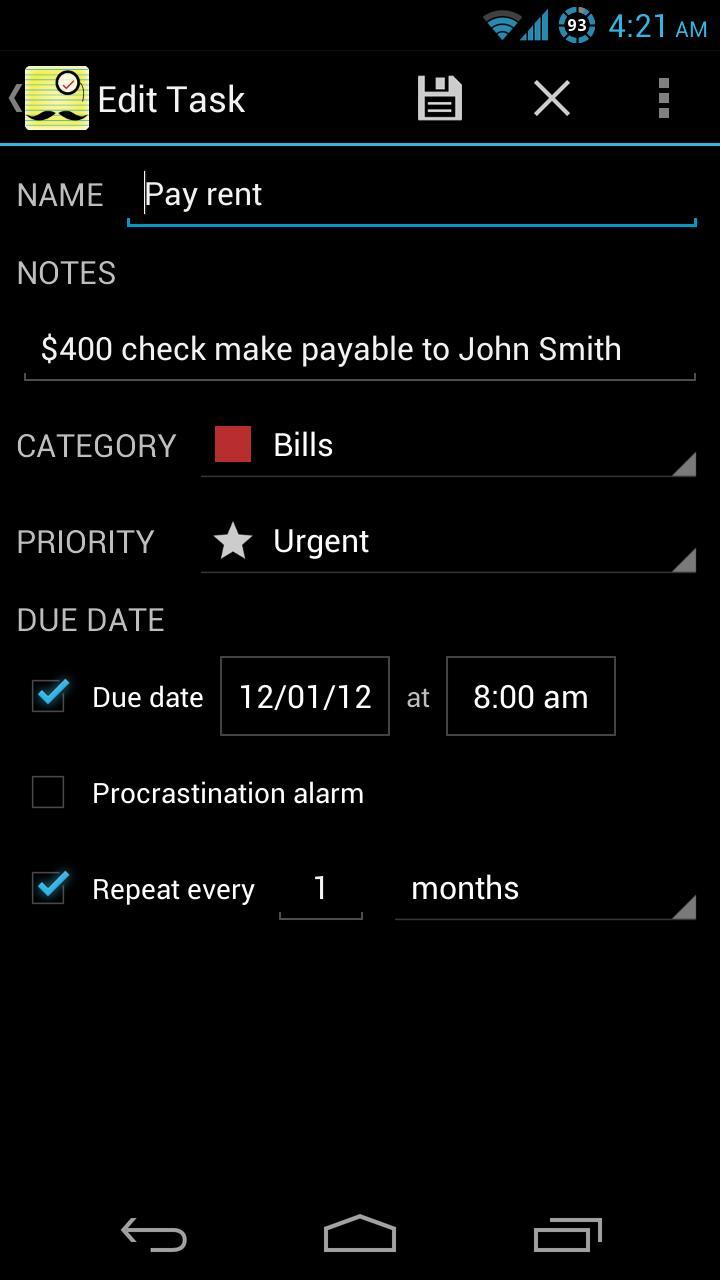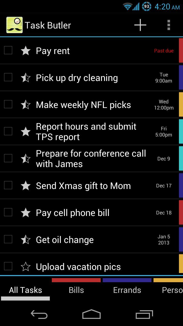 Use Task Butler to keep track of all of your shopping, errands, bills, to-do lists, and more. You can group your tasks into categories to create sub-lists of similar tasks. You can assign due dates to tasks, and Task Butler will remind you when it's time to complete them. For an especially time-sensitive task, use the procrastination alarm and Task Butler will make sure you finish it!