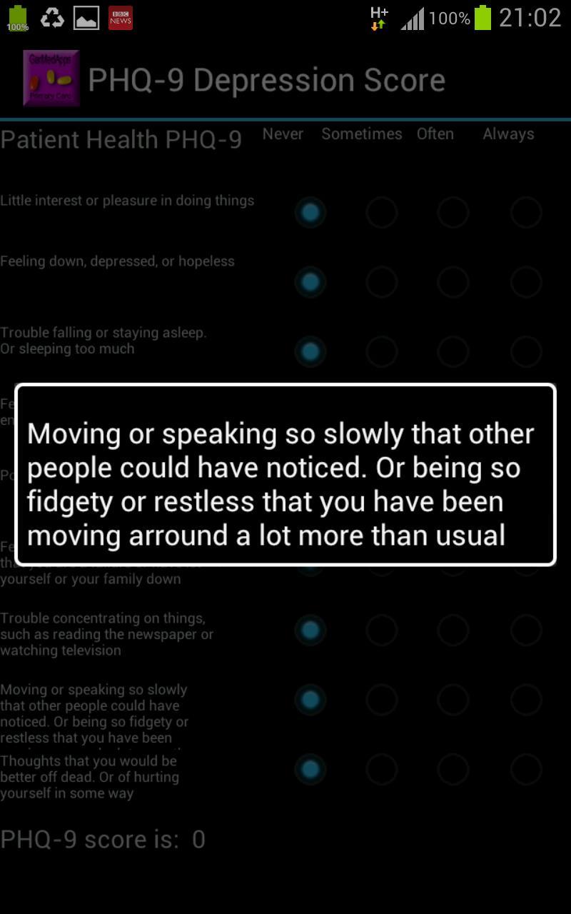 This is a simple to use and clean looking depression scoring system produced with permission form Pfizer who hold the copyright. It is aimed at health professionals to use as a consultation tool. There is no decision support, one should use local guidelines. It is one of several new Apps for primary care. If there is sufficient interest then I will develop it further, Suggestions are welcome.