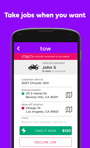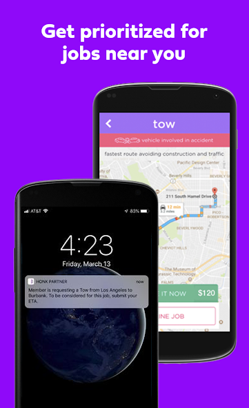 Turn your available downtime into an additional revenue stream by using the HONK Partner app to get connected to stranded motorists near you in real-time. By using the HONK Partner app you will get alerted of a job directly to your phone or tablet whenever someone near you needs assistance. With all job details presented in the app PRIOR to dispatch, you have the freedom to choose whether or not you want to take the job based on your availability.
