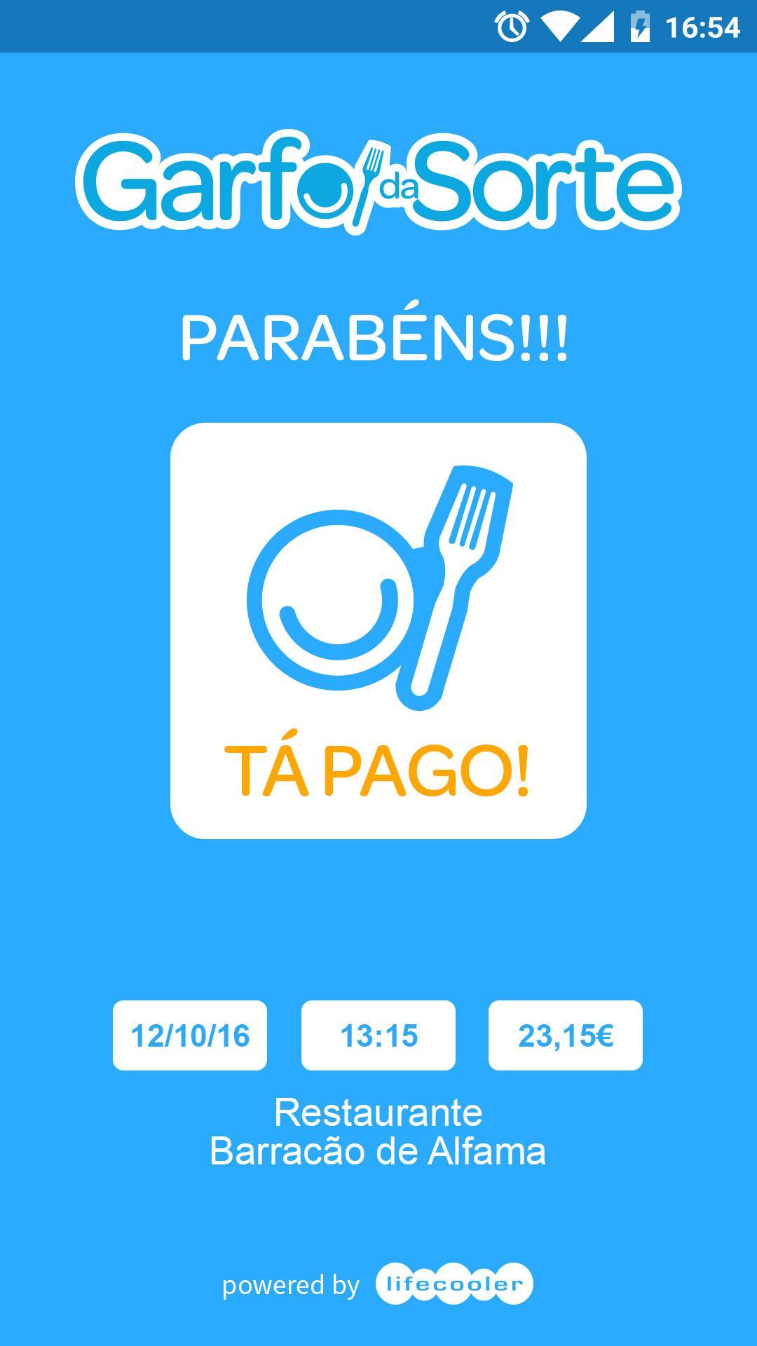For customers to participate, at the end of the meal, after asking for the bill and before paying, activate the "Garfo da Sorte" App and check if a meal is offered.
