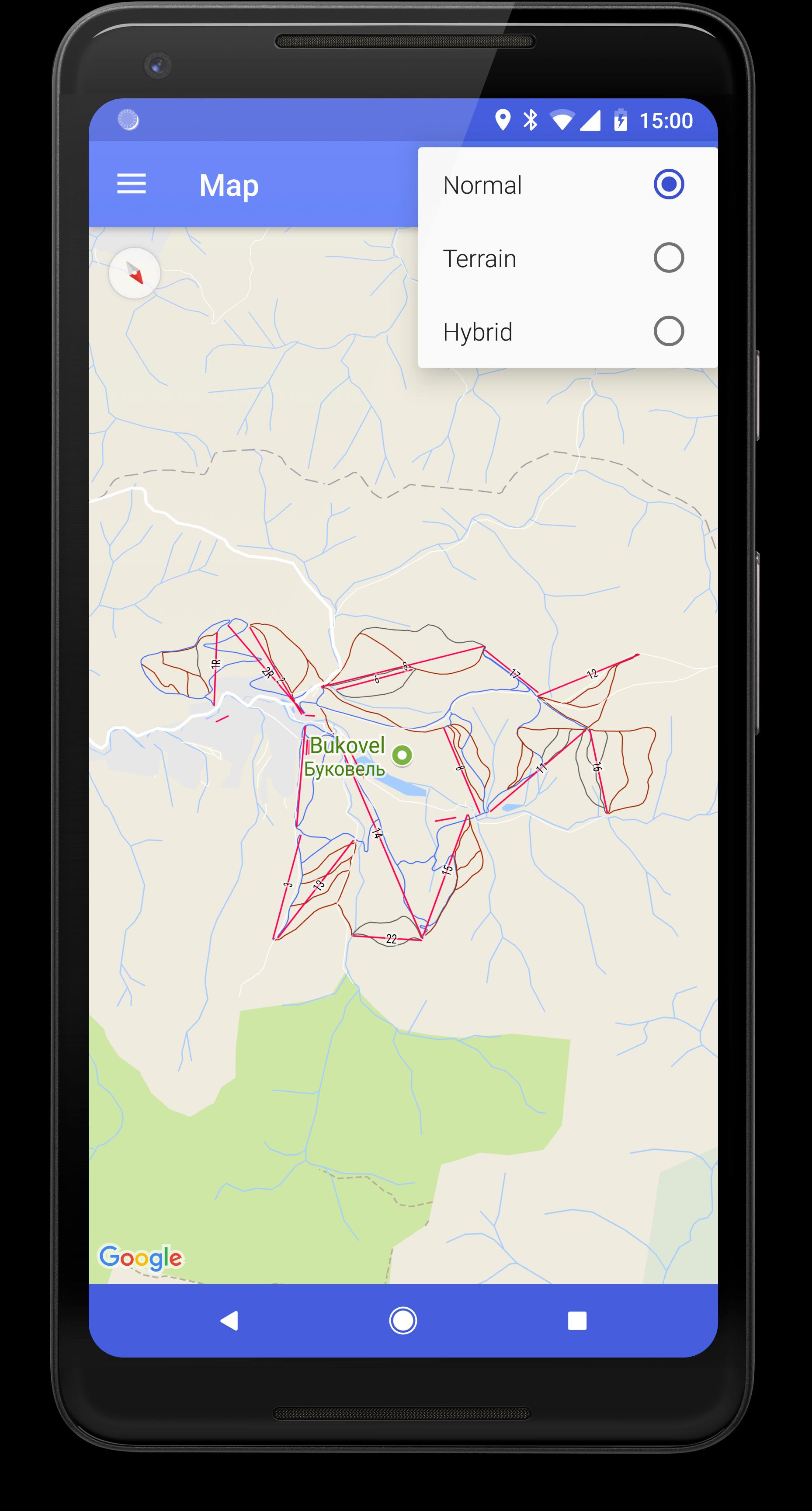 • a Google map of the resort with all of the lifts and trails marked, the app also shows your position on the map;