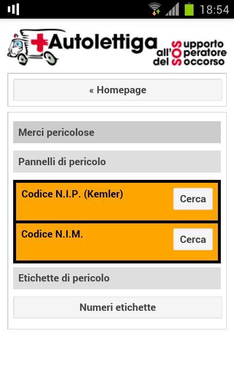 Functionality: Decodification of sending codes (SC01R, KC09V, PC04G, ...), dangerous tables and labels (including Kemler, Nip and Nim codes), phonetic alphabet, contact list and addresses of the realities of greater health interest.