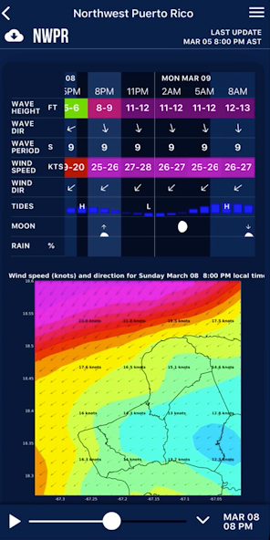 • Current Conditions: Wind, Waves, Tides, Moon Phase, Cloud Coverage and Rain Probability