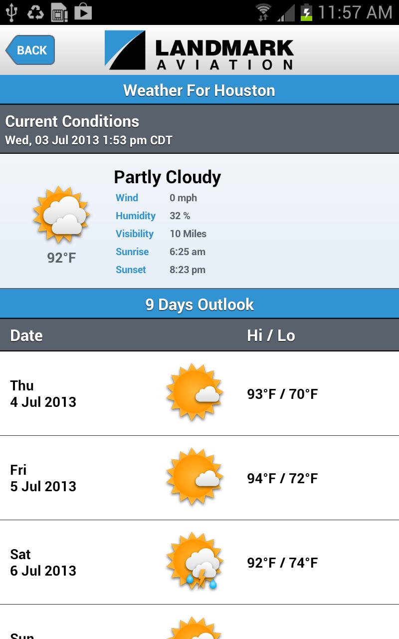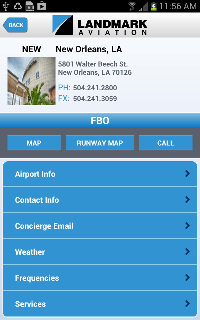 Connect 2 Landmark provides customers access to service and contact information for every FBO within the Landmark Aviation network. A comprehensive source for FBO service and amenity descriptions, runway maps, current weather conditions, as well as direct-dial features, the application assists general aviation pilots with their flight planning needs. Weather provided by Yahoo! Weather.