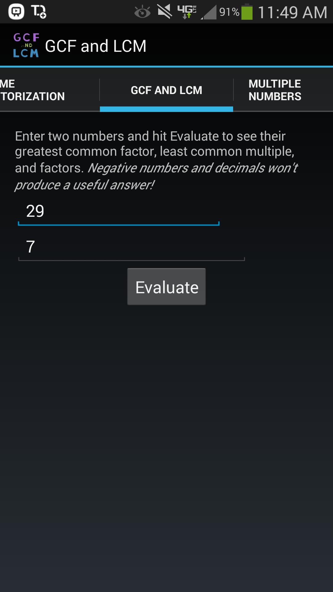 Have you ever wondered about the greatest common factor between 234556 and 3245? The least common multiple? How many total factors each number has? The prime factorization of 4856? Looking for the least common denominator between a bunch of fractions? You can look for th LCM between as many integers as you want. If you answered yes to any of these questions, this app will be very handy.
