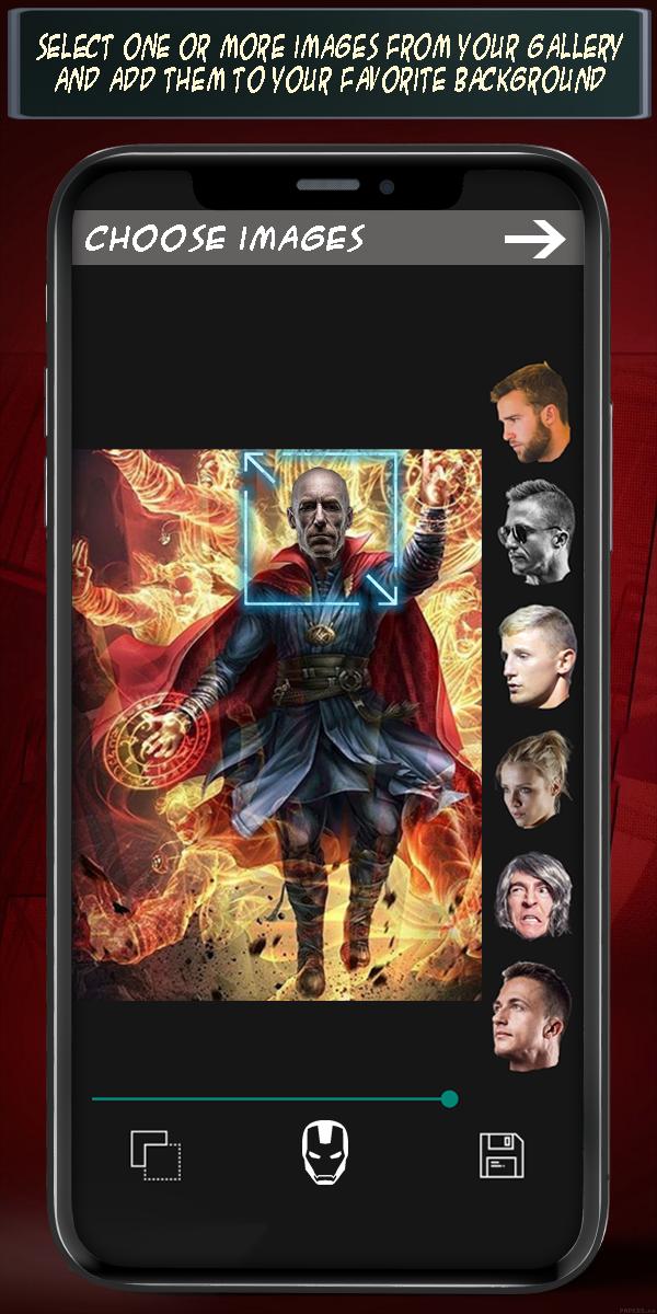 Superhero Photo Editor has a collection of HD and Ultra HD superheroes / wallpapers that give your photo a whole new look.