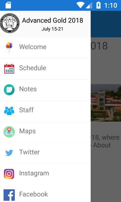 تم تصميم هذا التطبيق لجعل حياة أولئك الذين يحضرون Advanced Gold 2018 Simpler. من خلال نشر الجدول الزمني ، يمكن للمستخدمين رؤية أنشطتهم القادمة ومعرفة ما يمكن توقعه من كل يوم. مع إدراج قسم الملاحظات ، يمكن للمستخدمين تدوين ملاحظات مفصلة من أنشطتهم المختلفة طوال اليوم ، مما يسمح لهم بالحفاظ على جميع تجاربهم من الذهب المتقدم في تطبيق واحد مناسب. يتيح قسم دليل الموظفين للمستخدمين إيجاد الموظفين والتفاعل معهم لاكتساب فهم أعمق للمواد التي يتم تدريسها كل يوم. يتيح قسم الخرائط المضمّن للمستخدمين الحصول على سهولة الوصول إلى خريطة حرم الجامعة لجامعة Alvernia ، مما يتيح لهم على دراية بمناطقهم المحيطة. تتيح أقسام Twitter و Instagram و Facebook للمستخدمين العثور بسهولة مع حسابات وسائل التواصل الاجتماعي المتقدمة للذهب. يتيح قسم الطوارئ للمستخدمين العثور بسهولة على الأرقام التي سيحتاجون إلى الاتصال بها في حالة الطوارئ. أخيرًا ، تتيح صفحة المعلومات للمستخدمين الحصول على فهم أساسي للأسبوع قبل وصول المخيم. تتيح كل هذه الميزات مجتمعة إمكانية الوصول إلى كل ما قد يحتاجونه خلال وقتهم في Advanced Gold 2018 .