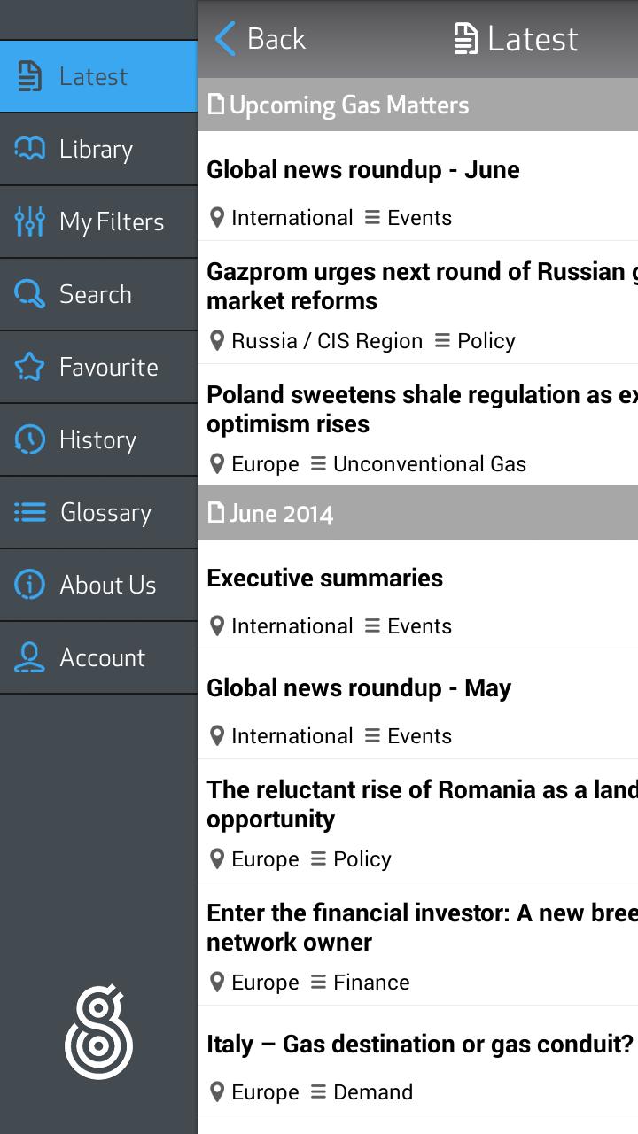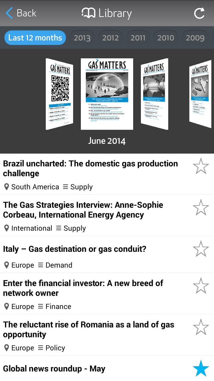 يتيح تطبيق Gas Matters للمستخدمين عرض قاعدة بيانات المقالة والبحث عنها مرة أخرى حتى عام 1993 مع القدرة على تصفية النتائج على نطاق واسع. يمنح هذا المورد القوي السياق لمخاطر الأعمال الرئيسية والفرص في قطاع الغاز الطبيعي وما بعده - الطاقة والانبعاثات والنفط والمصادرات المتجددة و LNG.
