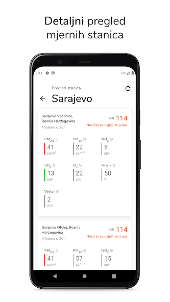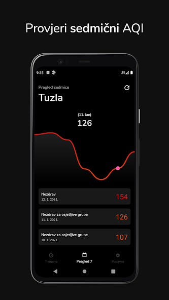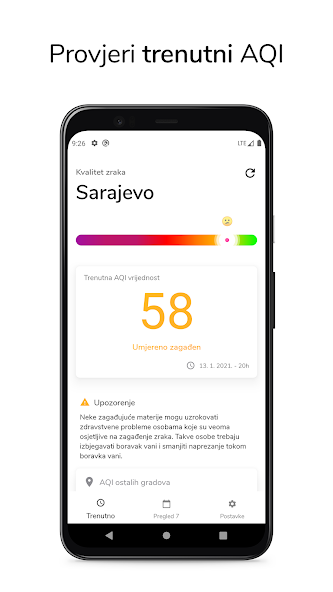 اكتشف القيمة الحالية لمؤشر تلوث الهواء لمدينتك أو انظر العرض الأسبوعي لقيم AQI. التطبيق مجاني تمامًا وتم إنشاؤه بهدف زيادة الوعي حول الهواء السيئ في البوسنة والهرسك.
