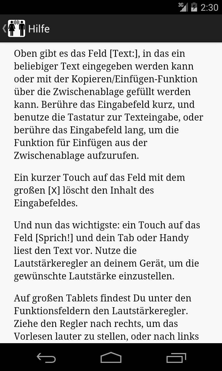 يعتمد التطبيق على وظيفة Android text-to-tpeech (TTS). لا توجد تكاليف إذا كنت تستخدم الأصوات المثبتة مسبقًا. أو يمكنك الحصول على أصوات أخرى في متجر Play من شركات مثل Cereproc أو Ivona أو SVOX.