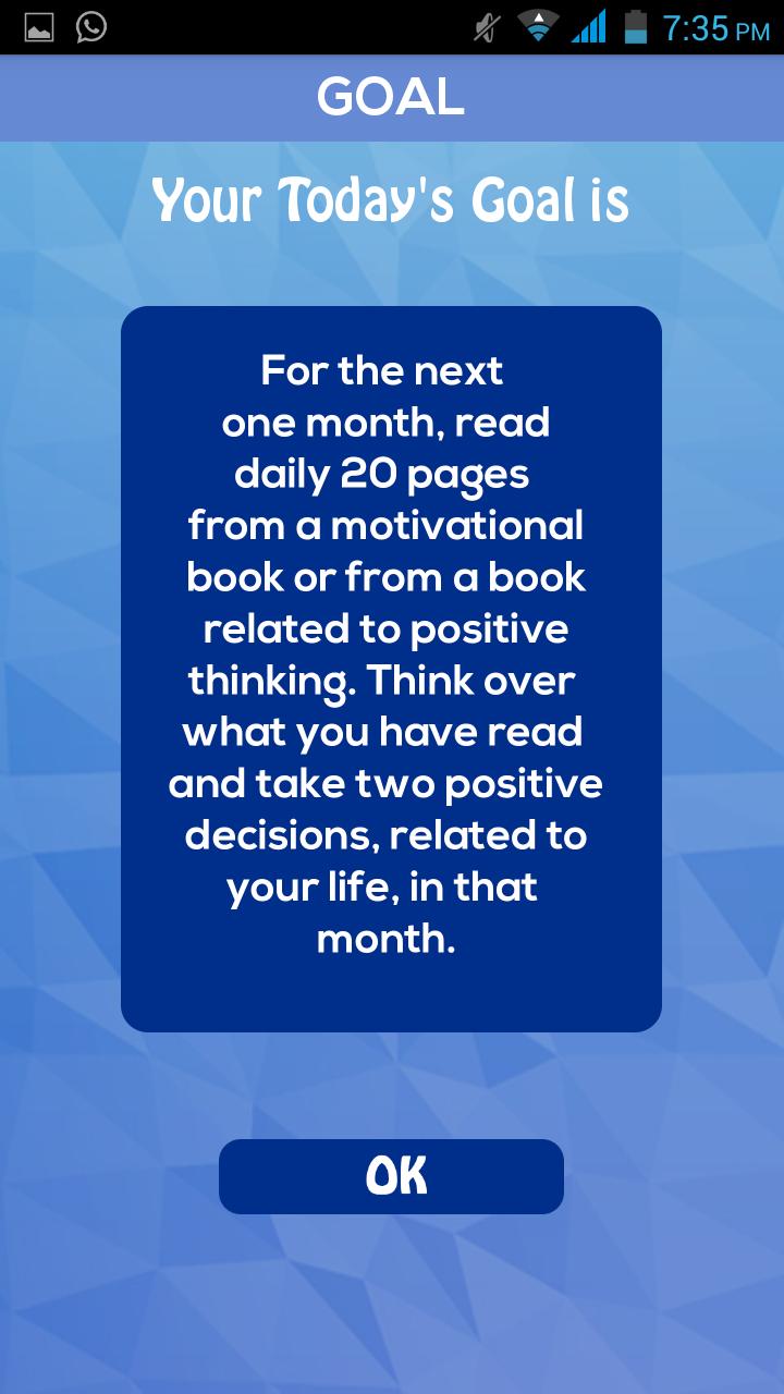 One Goal One day هو لعبة على وشك جعل المستخدمين حياة ناجحة. في هذه اللعبة ، يحصل المستخدم على المهمة اليومية على أساس حياته. إذا أكمل المستخدم المهمة ، فسوف يحصل على الذاكرة الافتراضية التي تساعد في الشراء في قرص مضغوط ، S من