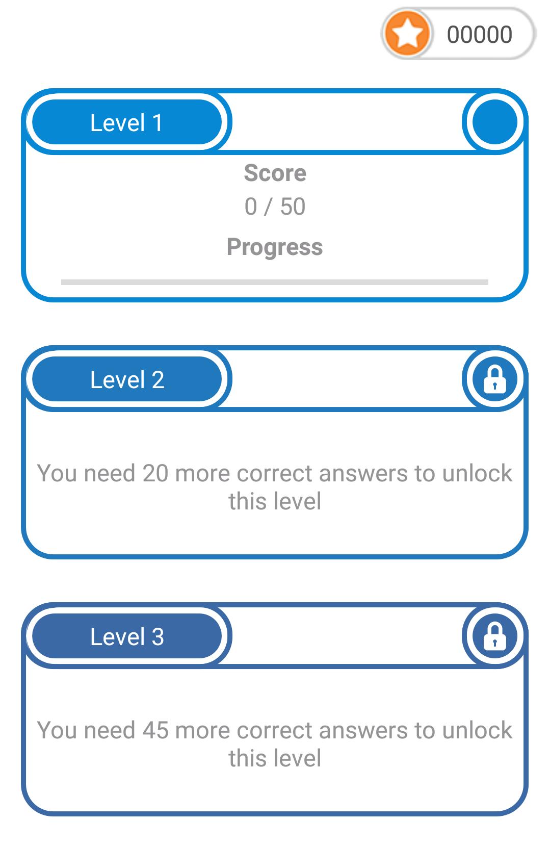 كل من ألعاب الاختبار والتوافه لديها مستويات متعددة لإلغاء قفلها من خلال تخمين الإجابة الصحيحة لعدد محدد من الألغاز في المستويات السابقة.
