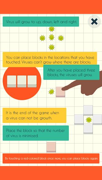 يمكنك وضع كتل في المواقع التي لمستها. لا يمكن أن تنمو الفيروسات حيث توجد كتل. بعد أن وضعت ثلاث كتل ، ستنمو الفيروسات. إنها نهاية اللعبة عندما لا يمكن أن يكون الفيروس نمواً. ضع الكتلة بحيث يتم تقليل عدد الفيروسات.