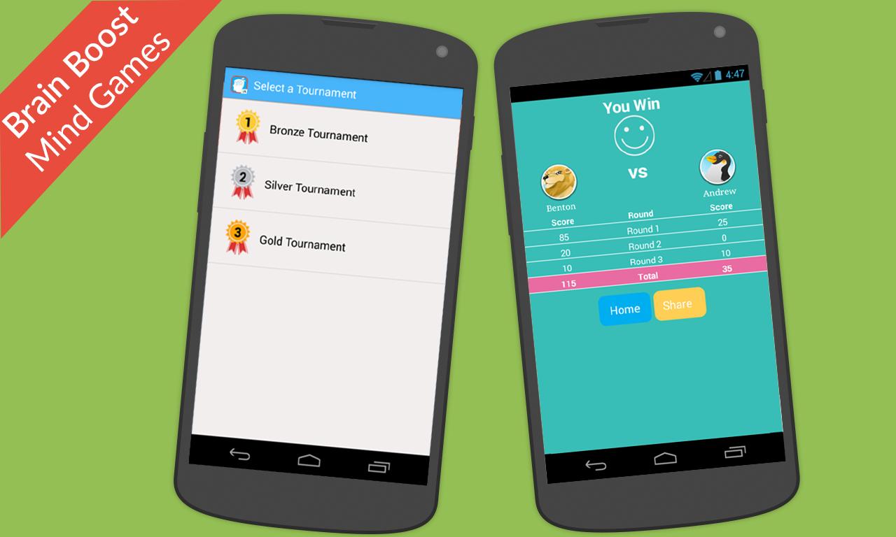 تتكون ألعاب الدماغ من ثلاث بطولات من البرونز والفضة والذهب. كل بطولة لديها خصم مختلف للعب معك. تتكون كل بطولة من 3 جولات. بعد كل لعبة Mind Mind ، يمكنك مشاركة درجاتك لجلب المزيد من الإثارة في اللعبة.