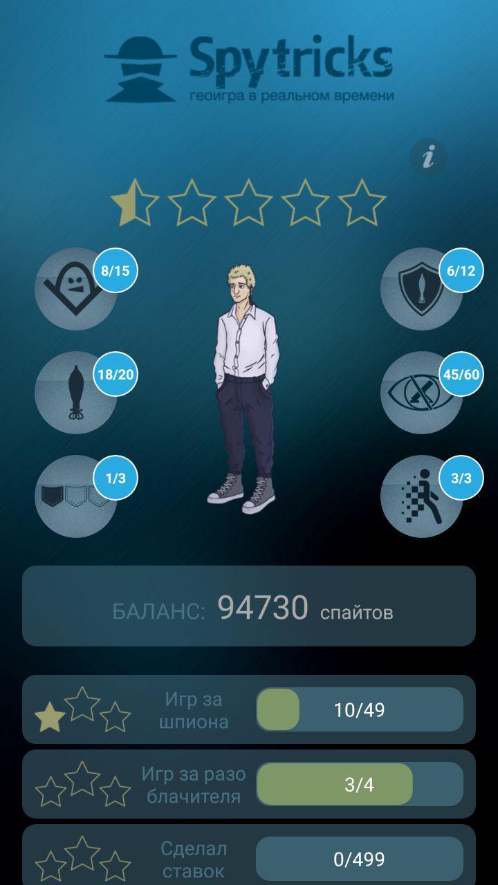 من أجل بدء اللعبة من أجل التجسس ، تحتاج إلى تحديد معلمات اللعبة (الشروط): الحد الأقصى لعدد المتطابرين والمعدل والنصف القطر ، الذي يجب أن تتضمنه التعرضات. المعلمة الرابعة هي الوقت الذي يجب أن يترك فيه الجاسوس المطاردين. كلما زاد الوقت الذي تختاره ، كلما كانت المسافة أقل في المهمة التي تحتاجها للذهاب لالتقاط قطعة أثرية. عند اختيار 15 دقيقة ، ستحتاج إلى التغلب على 1 كم إلى قطعة أثرية معروضة. 30 دقيقة سوف تحد من المسافة إلى قطعة أثرية من 750 متر. عند اختيار معلمة مدتها ساعة واحدة ، سيتم تخفيض المسافة إلى القطع الأثرية إلى 500 متر.