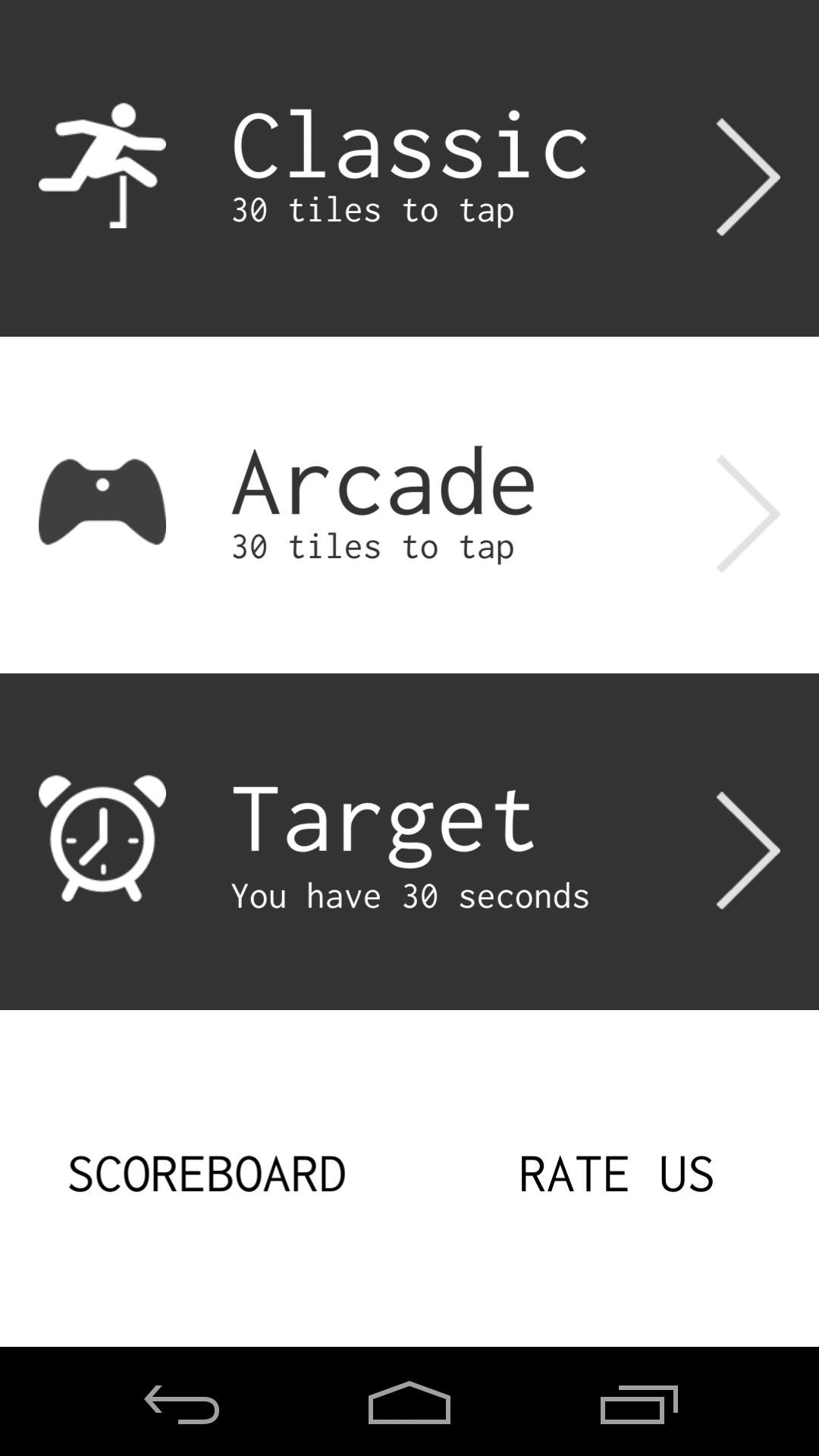 * الوضع الكلاسيكي: اضغط على 30 بلاطًا أسودًا ولا يتقدم أبدًا. عليك أن تنهي جميع البلاط بأسرع ما يمكن.