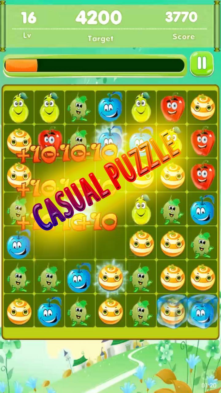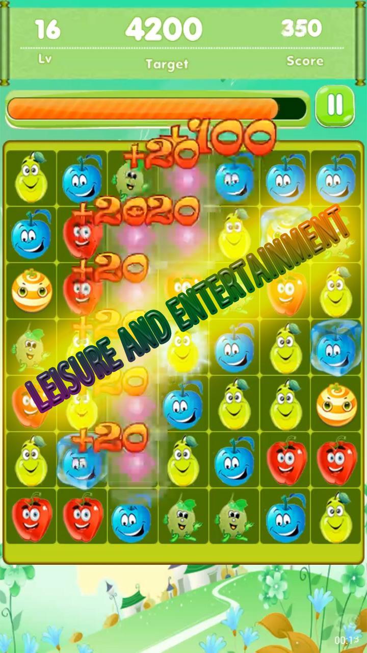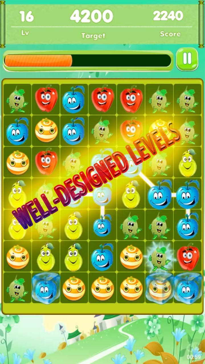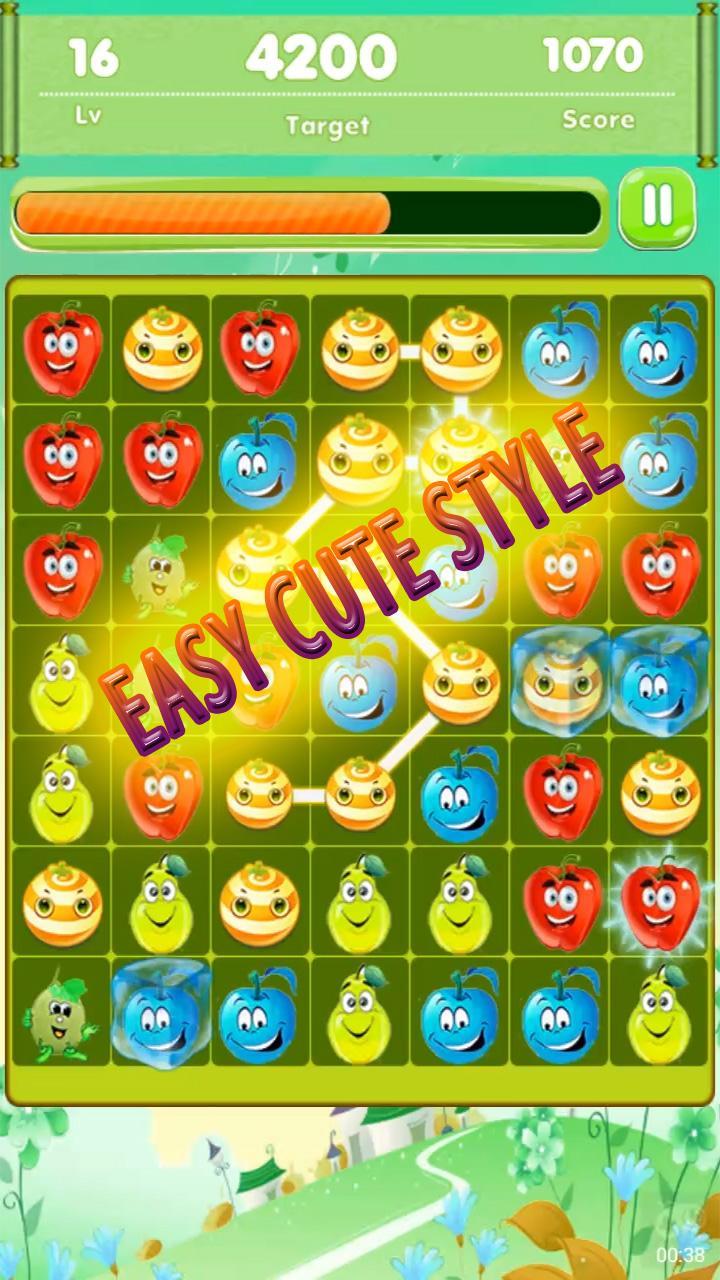 Happy Fruit Connection من خلال مطابقة ثلاث فواكه متطابقة أو أكثر ، حرك أصابعك واتصل إلى غارة الفاكهة والعصير.