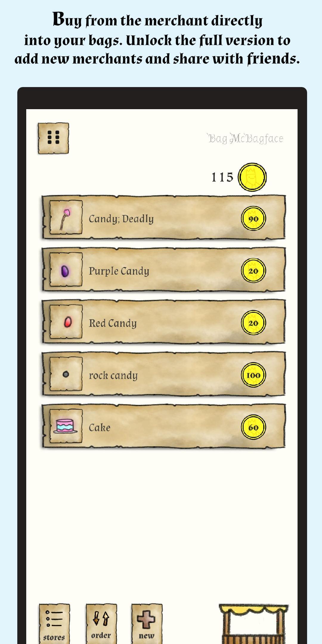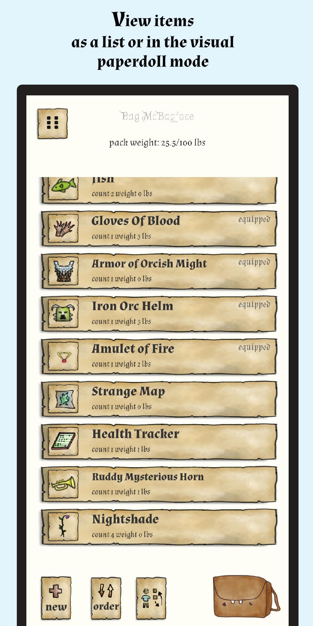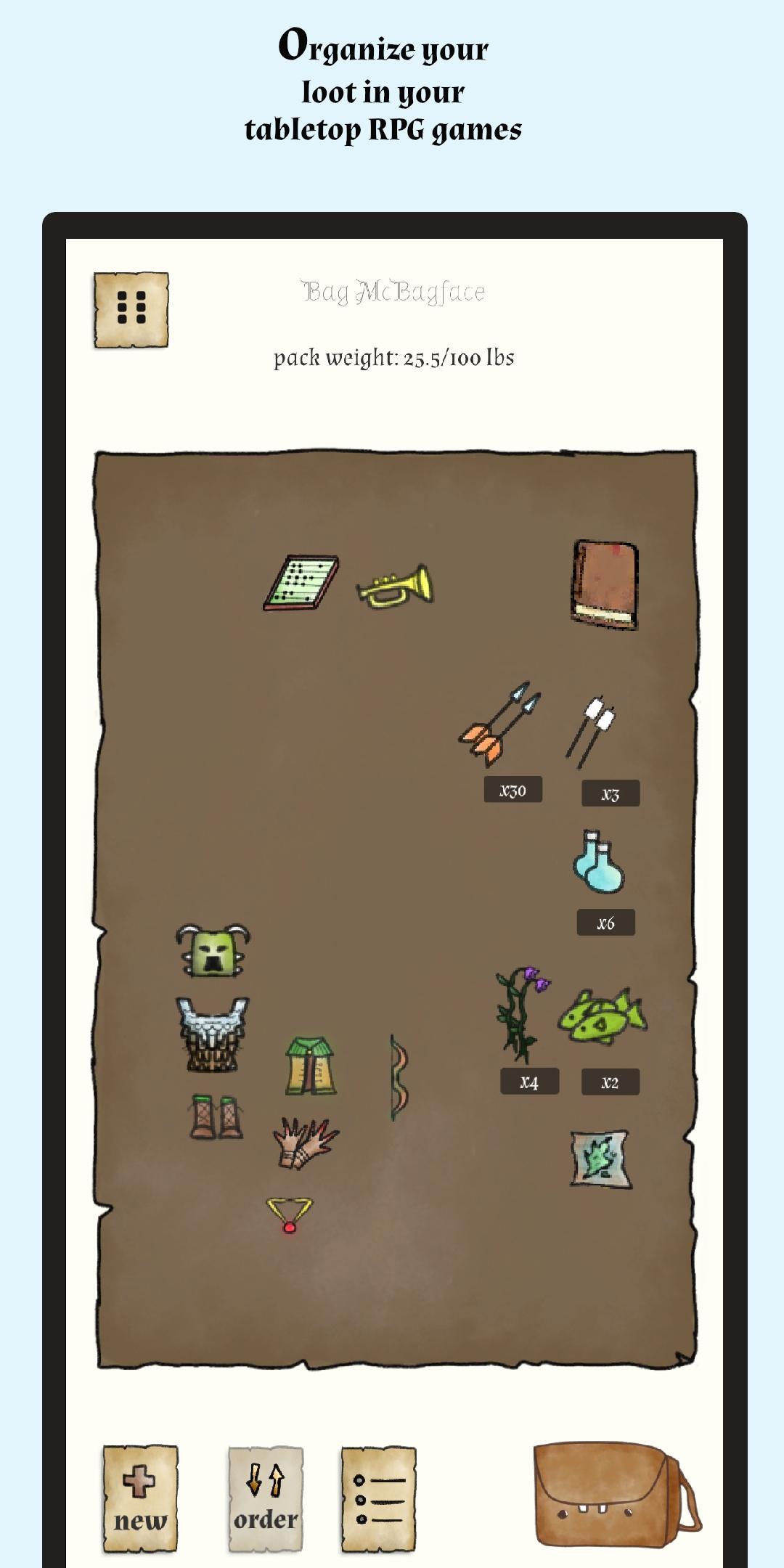 تتبع الذهب في محفظة العملة. استخدم الذهب لشراء العناصر الأساسية والسحر. قم بتحرير العناصر الخاصة بك بسهولة وتخصيصها عن طريق إضافة ملاحظات أو قواعد مفصلة. تتبع مهامك في مجلة وأضف عناصر مخصصة في مخزونك. ترى بسهولة مقدار الوزن الذي تحمله.