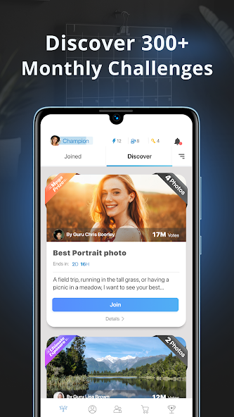 Wählen Sie jeden Monat aus über 300 neuen Herausforderungen und Wettbewerben für neue Themen. Teilen Sie Fotos, gewinnen Sie Stimmen und besteigen Sie die Reihen, um den ultimativen Titel des Guru zu erreichen.