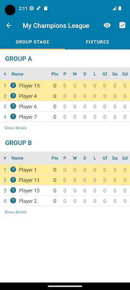 Derzeit sind vier Arten von Turnieren erhältlich: Meisterschaft, Knockout -Phase, Champions League und Weltmeisterschaft. Alle Ergebnisse werden endlos in einer Datenbank gespeichert, damit Sie Ihre persönlichen Statistiken konsultieren und feststellen können, wer der beste ist.